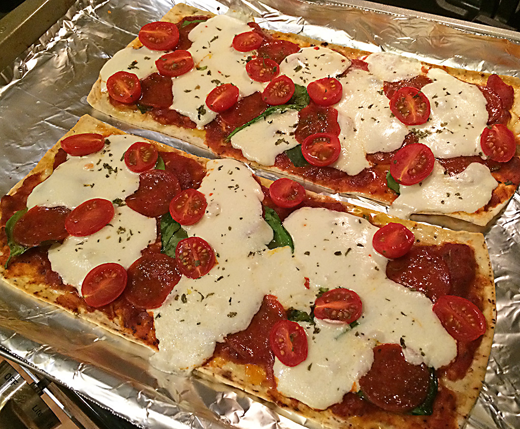 Spread the marinara sauce mixture over how many flatbread pizzas you are making. Notice I haven’t listed exact quantities of any of the ingredients, because I don’t know how many flatbread pizzas you are making and I just assume that all of you are smarter than me.