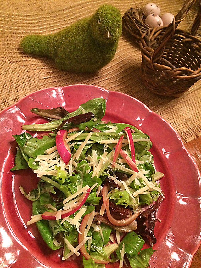 Pour a generous portion of EVOO into a mug and add a couple of heaping teaspoons of diced garlic. Warm this mixture in the microwave for 30-40 seconds and let it sit for a while. This let’s the garlic and EVOO have a chance to hang out together and get altogether tasty! While the EVOO and garlic are getting acquainted, I start making Poppy’s go-to salad.
