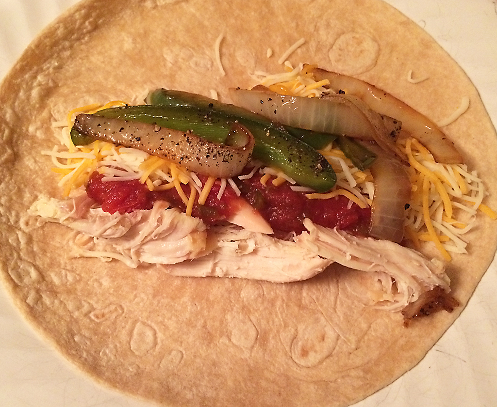 Now we are ready to start the enchilada assembly line. If you want to start playing Harry Belafonte’s “Jump in the Line” it would be totally appropriate. I usually microwave the tortillas while they are still in their plastic bag for 15-30 seconds just to warm and soften them up for this step. Then it’s just a matter of making a line of chicken meat, 2 tbsp. of salsa, couple pinches of shredded cheese and a row of the onion-pepper mix … fold the sides over enough to trap the ingredients then roll those babies up.