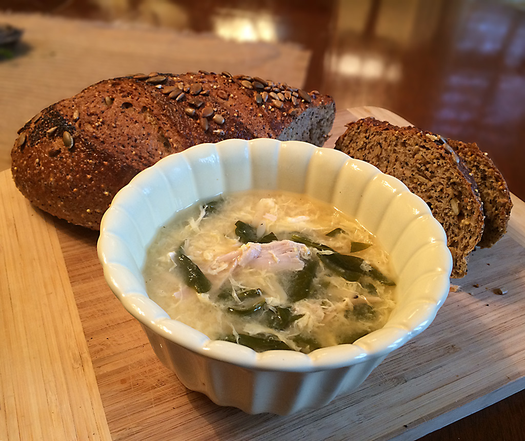 Separate the meat from the rotisserie chicken into small pieces. I didn’t want this to turn into a stew or even a chowder, so I only used about ⅔ of the chicken meat, saving one breast for another use. Add that to the broth along with the celery, onion, garlic mix and keep simmering. Add the Half & Half (you could use cream of course) and the hot sauce. Now it’s time for the black pepper to make it’s entrance. As a noob food-blogger, I didn’t measure the black pepper I added, partly because I was grinding it from my pepper mill directly into the soup. Set your pepper mill to coarse and crank at least 10 times into the broth. Let simmer for a few minutes then taste. I can tell you that I added at least another 10 turns of the pepper mill, probably more, but use your own judgement, keep tasting the broth … you can always add more pepper, taking it out is … well, impossible.