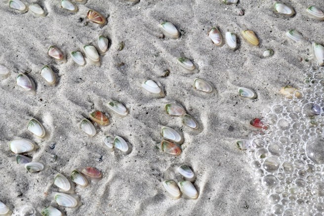 I force my hands through the wet sand, lifting as much as I can hold in each palm, then flip it over to form small mounds on either side of my bent legs. Each handful exposes dozens of colorful, tiny coquina clams. They lay there helpless on the beach until the next wave washes over them. That is their signal to right themselves and dig frantically back into the sand. I turned their world upside down, but the next wave restored order in their little universe.