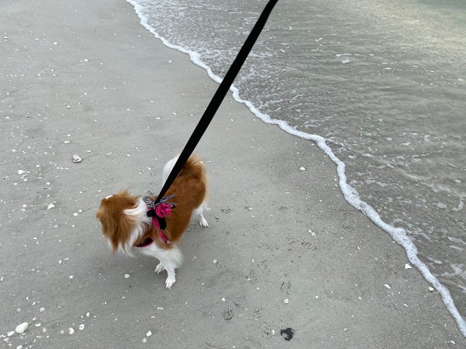 It’s official … if there were ever any doubt, Mimsy is not a Labrador Retriever. Apparently, she likes her water in shallow puddles and in drinking bowls. Vast spans of water that have no end in sight and are constantly in motion are not to be trusted. She wants nothing to do with even the gentle surf of the Gulf, and as you can see, she turns away, denying its existence.